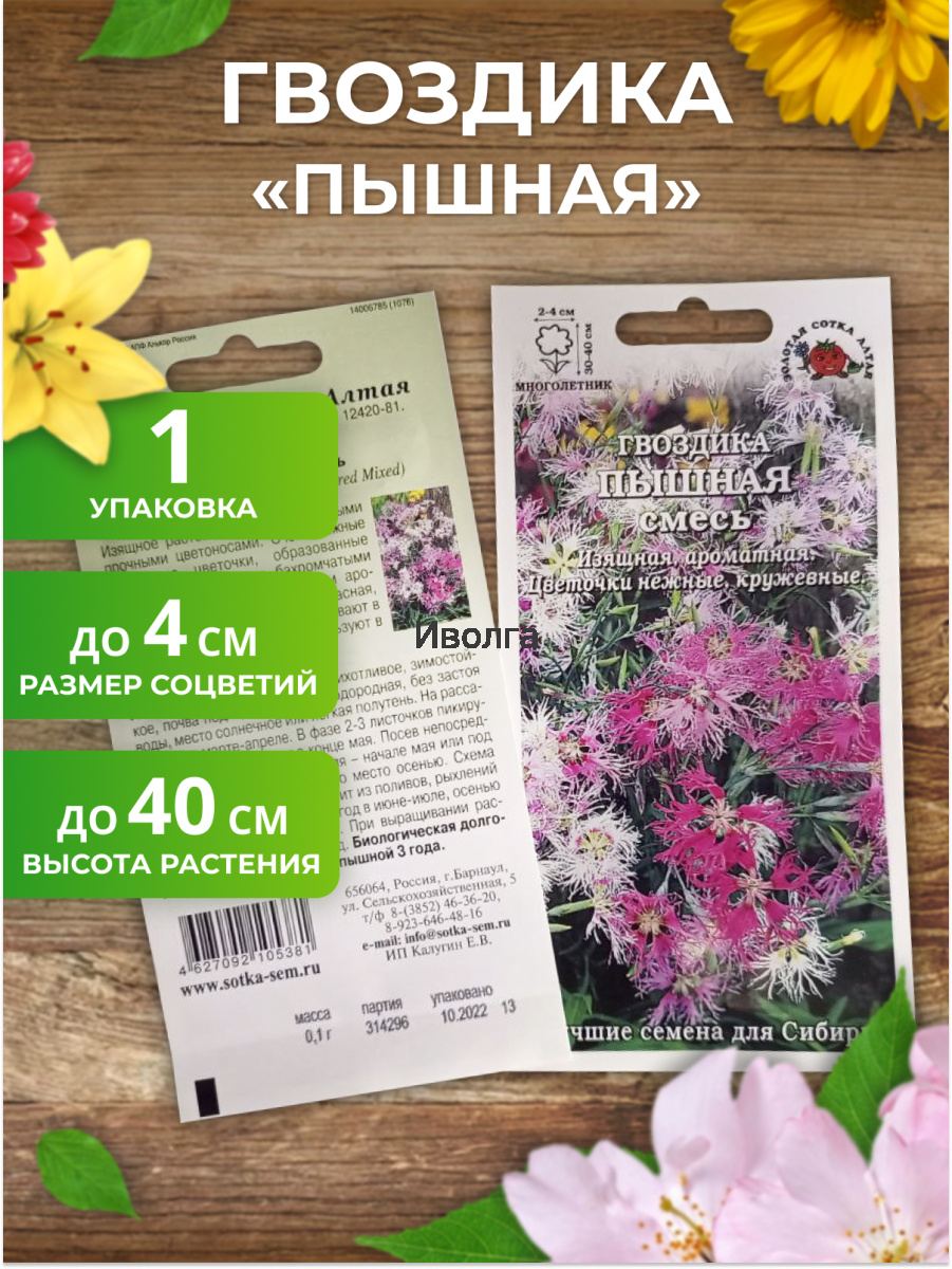 Гвоздика "Пышная" смесь сортов - растение до 40 см. высотой. Листья в основном прикорневые, узкие, образуют розетку. Цветоносы одиночные. Цветки до 3 см. в диаметре, душистые. Края лепестков глубоко разрезанные на нитевидные доли. Цветет со второй половины июня 45-50 дней. Используется для срезки, в групповой посадке, бордюрах, клумбах, массивах, каменистых горках и на срезку.