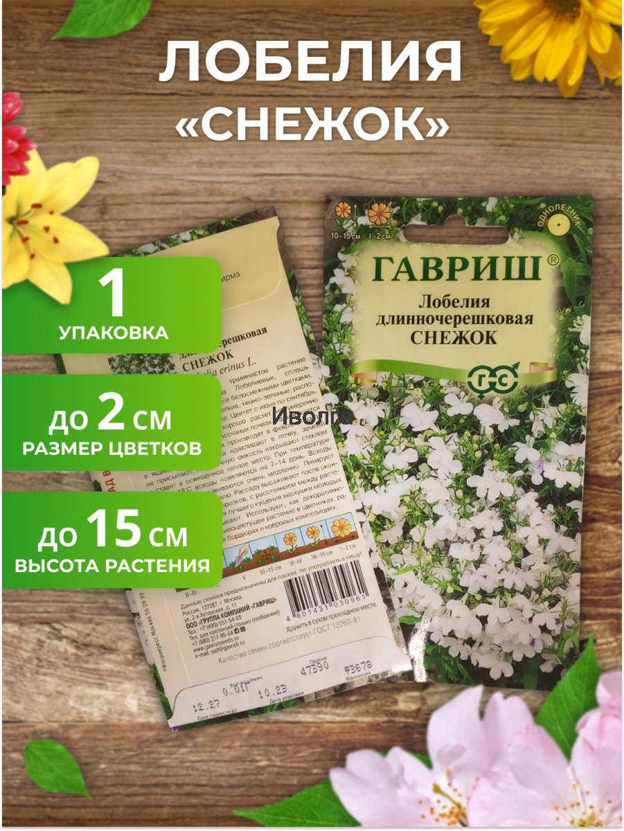 Лобелия длинночерешковая "Снежок" - красивое травянистое растение семейства Лобелиевые, сплошь усыпанное белоснежными цветками, диаметром 1-2 см. Листья мелкие, темно-зеленые, расположены в очередном порядке. Цветет с июня по сентябрь. Растение светолюбивое, хорошо растет на умеренно влажных суглинистых и супесчаных почвах. Размножается семенами, посев которых производят в феврале-марте в ящики.