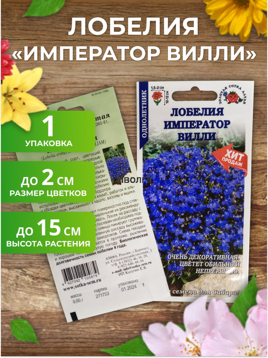 Лобелия однолетник "Император вилли" - многолетнее травянистое растение, используемое как однолетнее. Стебли тонкие, сильноветвящиеся от основания, густо облиственные. Кустики компактные, шаровидные, 10 см высотой. Листья расположены в очередном порядке, мелкие, ланцетные, цельные. Цветки до 2 см в диаметре, двугубые, на коротких цветоножках, по одному в пазухах листьев, ярко-синего цвета. Продолжительность и обильность цветения увеличиваются при своевременном удалении отцветших стеблей.