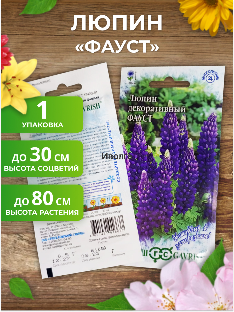 Люпин декоративный "Фауст" - многолетнее растение высотой около 80 см. Стебли прямые, прочные. Листья пальчатые, на длинных черешках. Цветки темно-фиолетовые, собраны в многоцветковые кистевидные соцветия до 30 см длиной. Цветет с июня в течение 20-30 дней, при своевременном удалении отцветающих соцветий наблюдается повторное цветение в августе. Размножают семенами и вегетативно.