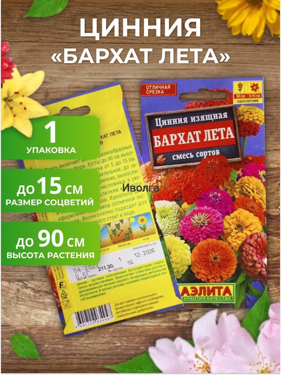 Цинния изящная "Бархат лета" смесь сортов - Ссмесь включает циннии разнообразных расцветок и форм. Кусты 50-80 см высотой, с диаметром цветка от 5 до 15 см, цветут обильно, длительно, с июня до заморозков. Растения крепкие, выносливые, неприхотливые, несложные в уходе, устойчивые к погодным стрессам. Идеальны для декорирования цветников солнечной экспозиции.
