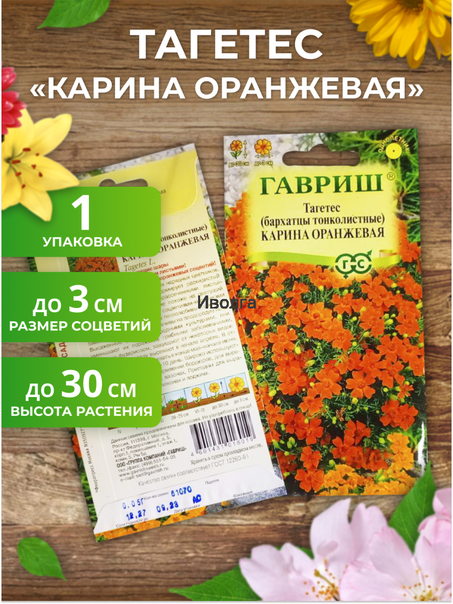 Тагетес (бархатцы тонколистные) "Карина оранжевая" - обильно цветущий сорт для ярких нарядных цветников. Растение сильноветвистое, формирует раскидистый кустик с изящными перисто-рассеченными листьями. В пору цветения растение похоже на цветущий шар, усыпанный оранжевыми соцветиями – корзинками до 3 см в диаметре. Бархатцы теплолюбивы и светолюбивы, засухоустойчивы, отзывчивы на плодородие почв.